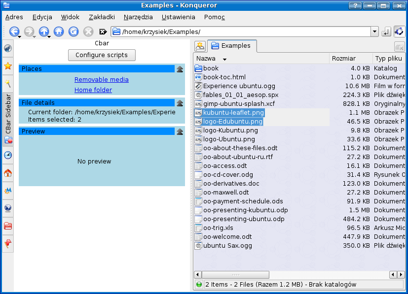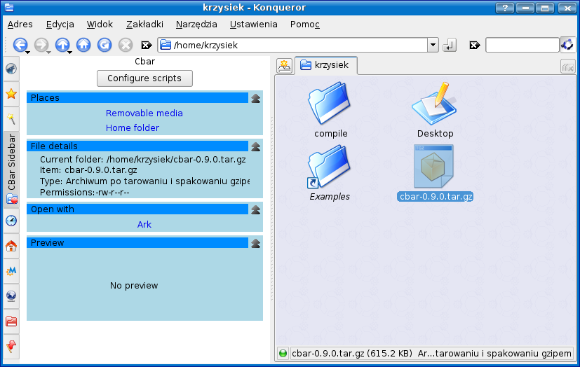 Compile and install package. Then add Cbar sidebar into Konqueror sidebar - open Konqueror, press F9 to show sidebar, click on configuration button, then "Add new"->"Cbar".